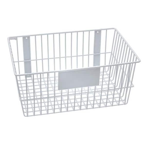 White Baskets Includes the following labels (stickers): Hair Nets, Beard Covers, Shoe Covers, Arm Protectors, Blank Customizable White Label (that can be written on with pen, marker or self-adhesive laser printed labels). End user selects the appropriate label for their application. Illustrated labels have a caricature showing the item in use, and tri-lingual wording (English, Spanish, French Canadian) to insure worker compliance.Mount Anywhere White Wire Basket with label plate for your storage and organizational needs. Dimensions: 18"L x 12"W x 8"H (Hardware included)