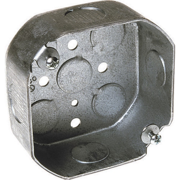 Octagon boxes are manufactured from durable pre-galvanized steel and are designed to house and protect electrical wiring switches receptacles and to support light fixtures. All steel octagon boxes are UL listed and acceptable for use in 2-hour fire rated walls and ceilings. 8-32 fixture mounting screws are assembled.
