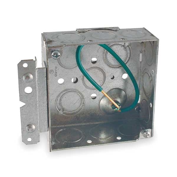 Electrical Box, Box Type Square with Bracket, Number of Gangs 2, Bracket Type H, Capacity 21 cu in, Material Steel, Number of 1/2 In. Back Knockouts 4, Number of 1/2 In. Side Knockouts 12, Clamp Type -, Number of 3/4 In. Back Knockouts 2, Number of 3/4 In. Side Knockouts 8, Nominal Depth 1 1/2 in, Nominal Length 1 1/2 in, Nominal Width 4 in, Color Gray, Standards UL Listed