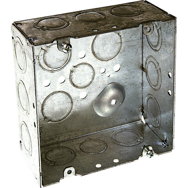 Steel outlet boxes square welded conduit wiring system. Two 1/2 inch and ten TKO conduit knockouts (sides). One 1/2 inch two 3/4 inch and two TKO conduit knockouts (bottom). No bracket installed in ceilings or walls for lighting fixtures or receptacles. Combination cover screw heads provide for faster mud ring or cover installation. UL Listed.
