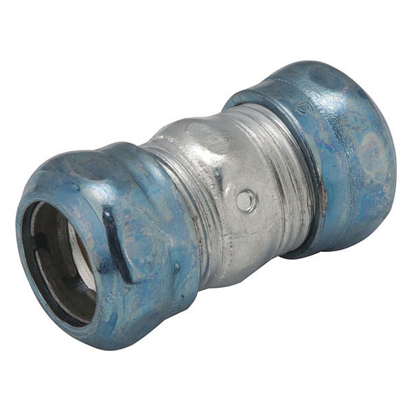 Compression Conduit Coupling, Steel, Trade Size 3/4 in, Overall Length 2 5/32 in, Finish Zinc Plated, Compatible Conduit Type EMT, Conduit Fitting Type Coupling, Standards cULus Listed, UL 514B, For Use With EMT, For Conduit Type EMT, Overall Height 1 11/32 in, Overall Width 1 1/4 in, Weight 0.18 lb, Color Blue, Gray, Compatible Conduit Trade Size 3/4 in, Connection Orientation Straight, Connection Type Compression, Includes Clamp, Inside Diameter 0.87 in, Outside Diameter 1.35 in