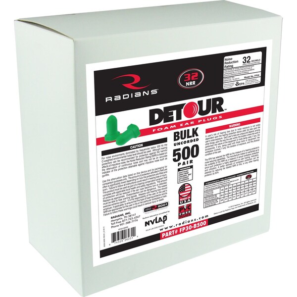 Bulk 500 pair of uncorded Detour foam earplugs; Not individually packaged; Great for refilling dispensers; Made in USA