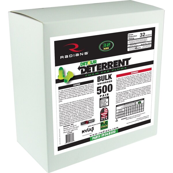 Bulk 500 pair of uncorded Deterrent foam earplugs; Comfortable Wing Shape; Dual Color – Yellow and Green; Offers a comfortable fit for virtually any ear canal; Extremely Soft Foam Plug; Provides a comfortable, low-pressure fit; Made in USA; Meets ANSI S3.19 standards; NRR 32 dB