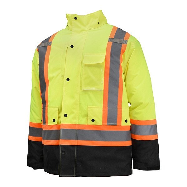 The SJ610B is a feature-packed garment designed for functionality and convenience in multiple seasons! Wind and water-resistant, this coat is made up of an outer parka and a reversible bomber with zip-off sleeves. The parka and bomber are Type R Class 3 compliant and the vest is Type R Class 2 compliant. Wear all pieces together as a complete system in extreme conditions or wear separately as a parka, bomber jacket, or vest depending on the weather conditions or your activity level. Both the bomber and the vest are also reversible going from hi-vis to stylish black for everyday use. The parka has a detachable hood, a quilted lining for easy on and off, zipper closure, and storm flap. Worn alone, it serves as a rain jacket too. It has multiple pockets including radio pockets, vertical zip pockets, chest pockets, and lower jacket pockets. Plus, there are mic tabs on both the parka and bomber. The black color-blocking extends the useful life hiding dirt and grime, and the silver reflective tape on contrast trim keeps workers visible.