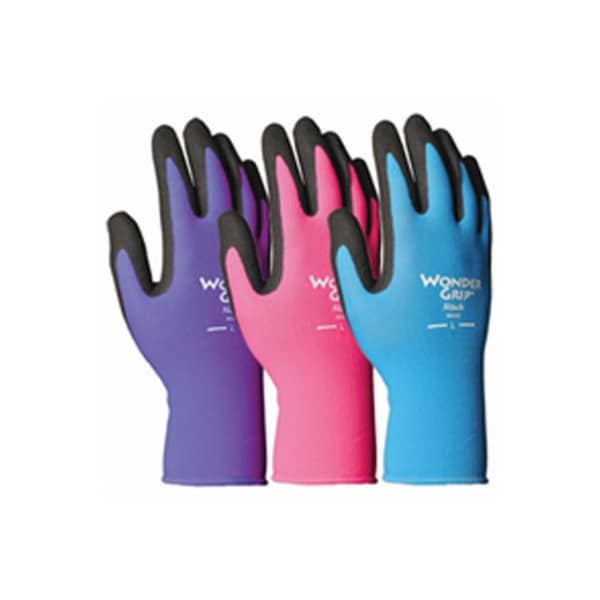 Bellingham Wonder Grip, large, nicely nimble garden gloves, 3 assorted colors pink, purple, blue, vivid 15 gauge nylon knit liners with wonder grip microporous coating on palm fingertips Wonderfully light flexible
