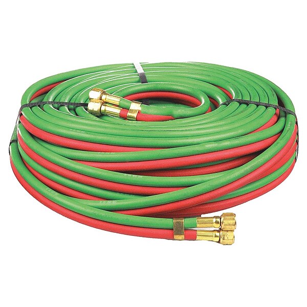 Twin Line Welding Hose, Hose Inside Dia. 3/16 in, Hose Length 50 ft, Hose Color Green, Red, Hose Tube Material Synthetic Rubber, Hose Configuration Coupled Assembly, Hose Grade T, Hose Fitting A Type BB, Hose Fitting B Type BB