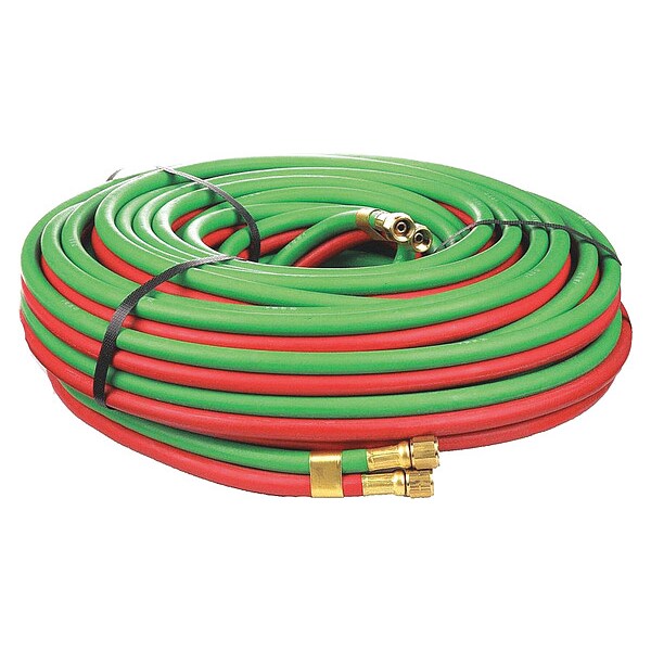 Twin Line Welding Hose, Hose Inside Dia. 5/16 in, Hose Length 100 ft, Hose Color Green, Red, Hose Tube Material Synthetic Rubber, Hose Configuration Coupled Assembly, Hose Grade T, Hose Fitting A Type BB, Hose Fitting B Type BB