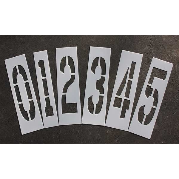 Stencil Set, Character Type Number Set, Duty Light, FAA AC 150/5340-1K Compliant No, Font Highway Gothic, Included Characters, Messages, and Symbols 0 to 9, Blank ( ), Includes (2) Blanks, Individual Character Height 36 in, Individual Character Width 12 in, Interlocking No, Interlocking Orientation Not Applicable, Material Polyethylene, Message or Symbol Height Not Applicable, Message or Symbol Width Not Applicable, Number of Pieces 12, Overall Stencil Height 48 in