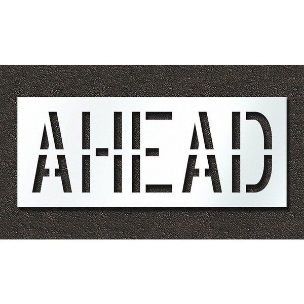 Individual Stencil, Character Type Message, Duty Heavy, FAA AC 150/5340-1K Compliant No, Font Highway Gothic, Included Characters, Messages, and Symbols Ahead, Individual Character Height Not Applicable, Individual Character Width Not Applicable, Interlocking No, Interlocking Orientation Not Applicable, Material Polyethylene, Message or Symbol Height 18 in, Message or Symbol Width 53 in, Number of Pieces 1, Overall Stencil Height 24 in, Overall Stencil Thickness 0.125 in