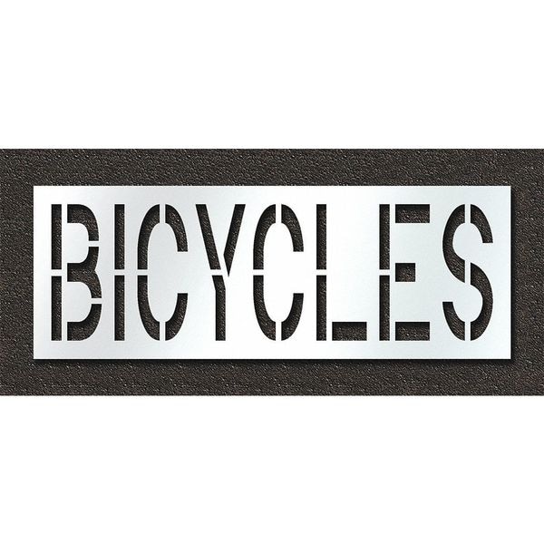 Individual Stencil, Character Type Message, Duty Heavy, FAA AC 150/5340-1K Compliant No, Font Highway Gothic, Included Characters, Messages, and Symbols Bicycles, Individual Character Height Not Applicable, Individual Character Width Not Applicable, Interlocking No, Interlocking Orientation Not Applicable, Material Polyethylene, Message or Symbol Height 24 in, Message or Symbol Width 78 in, Number of Pieces 1, Overall Stencil Height 30 in, Overall Stencil Thickness 0.125 in