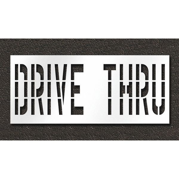 Individual Stencil, Character Type Message, Duty Heavy, FAA AC 150/5340-1K Compliant No, Font Highway Gothic, Included Characters, Messages, and Symbols Drive Thru, Individual Character Height Not Applicable, Individual Character Width Not Applicable, Interlocking No, Interlocking Orientation Not Applicable, Material Polyethylene, Message or Symbol Height 36 in, Message or Symbol Width 106 in, Number of Pieces 1, Overall Stencil Height 48 in, Overall Stencil Thickness 0.125 in