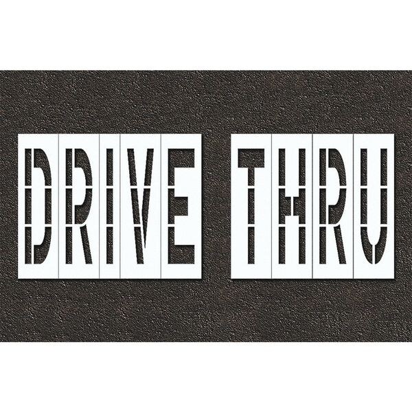 Individual Stencil, Character Type Message, Duty Heavy, FAA AC 150/5340-1K Compliant No, Font Highway Gothic, Included Characters, Messages, and Symbols Drive Thru, Individual Character Height Not Applicable, Individual Character Width Not Applicable, Interlocking No, Interlocking Orientation Not Applicable, Material Polyethylene, Message or Symbol Height 48 in, Message or Symbol Width 147 in, Number of Pieces 1, Overall Stencil Height 60 in, Overall Stencil Thickness 0.125 in