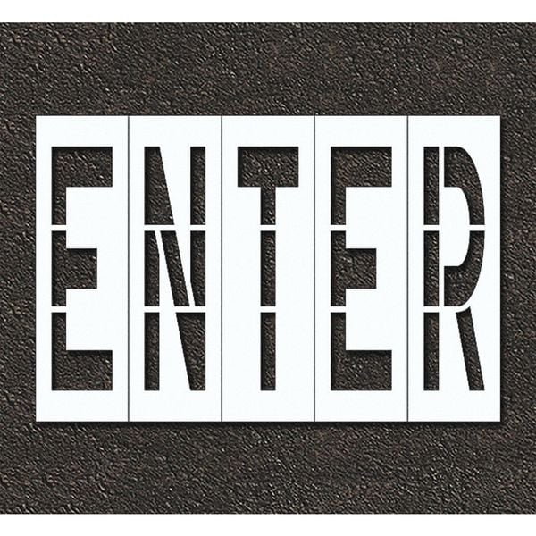 Individual Stencil, Character Type Message, Duty Heavy, FAA AC 150/5340-1K Compliant No, Font Highway Gothic, Included Characters, Messages, and Symbols Enter, Individual Character Height Not Applicable, Individual Character Width Not Applicable, Interlocking No, Interlocking Orientation Not Applicable, Material Polyethylene, Message or Symbol Height 48 in, Message or Symbol Width 84 in, Number of Pieces 1, Overall Stencil Height 60 in, Overall Stencil Thickness 0.125 in