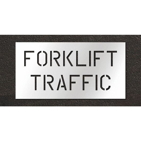 Individual Stencil, Character Type Message, Duty Heavy, FAA AC 150/5340-1K Compliant No, Font Highway Gothic, Included Characters, Messages, and Symbols Forklift Traffic, Individual Character Height Not Applicable, Individual Character Width Not Applicable, Interlocking No, Interlocking Orientation Not Applicable, Material Low Density Polyethylene (LDPE), Message or Symbol Height 15 in, Message or Symbol Width 35 in, Number of Pieces 1, Overall Stencil Height 21 in