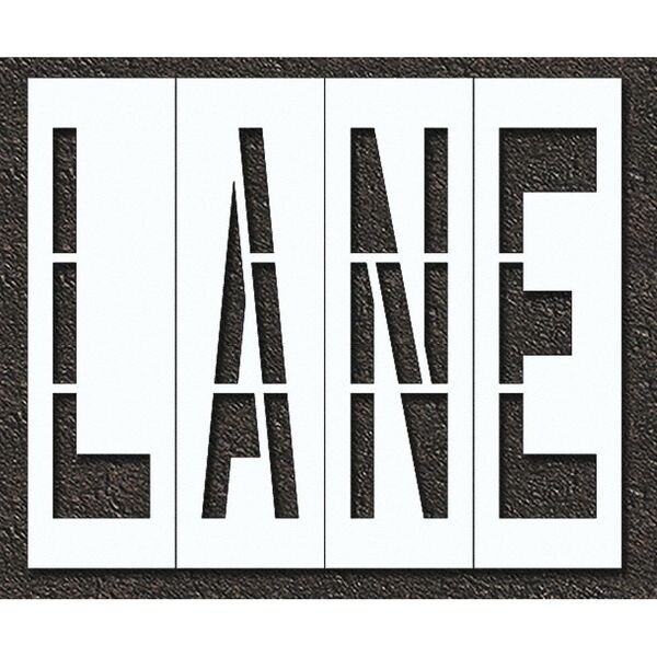 Individual Stencil, Character Type Message, Duty Heavy, FAA AC 150/5340-1K Compliant No, Font Highway Gothic, Included Characters, Messages, and Symbols Lane, Individual Character Height Not Applicable, Individual Character Width Not Applicable, Interlocking No, Interlocking Orientation Not Applicable, Material Polyethylene, Message or Symbol Height 96 in, Message or Symbol Width 132 in, Number of Pieces 4, Overall Stencil Height 120 in, Overall Stencil Thickness 0.125 in
