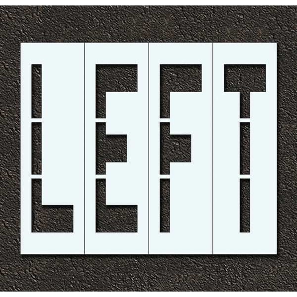 Individual Stencil, Character Type Message, Duty Light, FAA AC 150/5340-1K Compliant No, Font Highway Gothic, Included Characters, Messages, and Symbols Left, Individual Character Height Not Applicable, Individual Character Width Not Applicable, Interlocking No, Interlocking Orientation Not Applicable, Material Polyethylene, Message or Symbol Height 96 in, Message or Symbol Width 132 in, MUTCD Compliant Yes, Number of Pieces 4, Overall Stencil Height 104 in, Overall Stencil Thickness 0.063 in