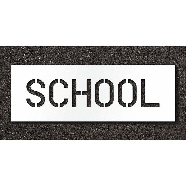 Individual Stencil, Character Type Message, Duty Heavy, FAA AC 150/5340-1K Compliant No, Font Highway Gothic, Included Characters, Messages, and Symbols School, Individual Character Height Not Applicable, Individual Character Width Not Applicable, Interlocking No, Interlocking Orientation Not Applicable, Material Polyethylene, Message or Symbol Height 6 in, Message or Symbol Width 28 in, Number of Pieces 1, Overall Stencil Height 12 in, Overall Stencil Thickness 0.125 in