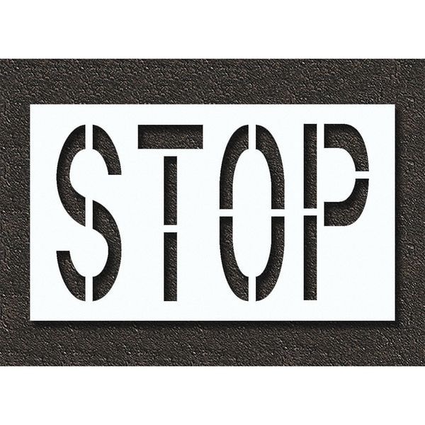Individual Stencil, Character Type Message, Duty Heavy, FAA AC 150/5340-1K Compliant No, Font Highway Gothic, Included Characters, Messages, and Symbols Stop, Individual Character Height Not Applicable, Individual Character Width Not Applicable, Interlocking No, Interlocking Orientation Not Applicable, Material Polyethylene, Message or Symbol Height 24 in, Message or Symbol Width 42 in, Number of Pieces 1, Overall Stencil Height 30 in, Overall Stencil Thickness 0.125 in