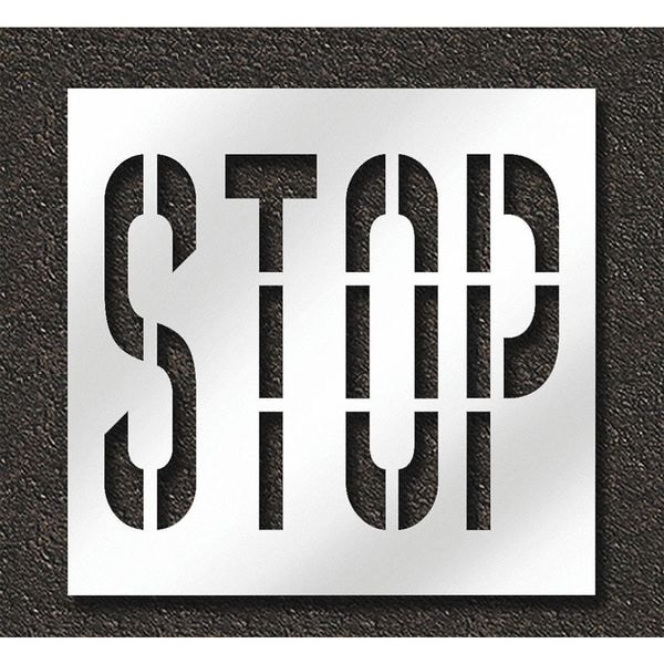 Individual Stencil, Character Type Message, Duty Heavy, FAA AC 150/5340-1K Compliant No, Font Highway Gothic, Included Characters, Messages, and Symbols Stop, Individual Character Height Not Applicable, Individual Character Width Not Applicable, Interlocking No, Interlocking Orientation Not Applicable, Material Polyethylene, Message or Symbol Height 36 in, Message or Symbol Width 44 in, Number of Pieces 1, Overall Stencil Height 48 in, Overall Stencil Thickness 0.125 in
