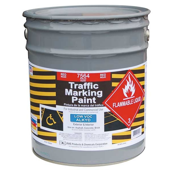 Traffic Zone Marking Paint, Alkyd Solvent Base Type, Line Striping Aerosol No, Red, Size 5 gal, Traffic Zone Marking Paint, Paint and Primer Surface Material Asphalt, Brick, Concrete, Grass, Paint and Primer Application Method Brush, Roller, Striping Machine, Coverage 90 Linear ft/gal (4 in Strip), Net Weight 18.9 L, Dry Time 30 to 40 min, Dry Time Tack Free 20 min, Application Temperature 40 Degrees to 90 Degrees F, Mild to Moderate Exposure Conditions, VOC Content 148 g/L