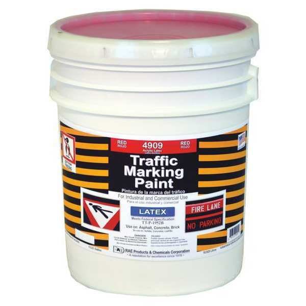 Traffic Zone Marking Paint, Latex Acrylic Base Type, Line Striping Aerosol No, Red, Size 5 gal, Traffic Zone Marking Paint, Paint and Primer Surface Material Asphalt, Brick, Concrete, Grass, Paint and Primer Application Method Brush, Roller, Striping Machine, Coverage 420 Linear ft/gal (4 in Strip), Net Weight 18.9 L, Dry Time 1 to 2 hr, Dry Time Tack Free 30 min, Application Temperature 40 Degrees to 100 Degrees F, Mild to Moderate Exposure Conditions, VOC Content 68 g/L, Standards TT-P-1952B