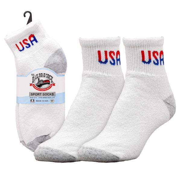 Put Some Pride in Your Stride. Celebrate comfort and country with our quarter-length patriotic socks, featuring bold red and blue USA embroidery on the ankle. These white low-cut athletic socks are designed for all-day support and a secure fit-perfect for workouts, barbecues, or just repping your American pride on the go. Wear them at the gym, on a run, or during your next holiday weekend-wherever you go, these socks deliver standout comfort with a touch of patriotic flair.