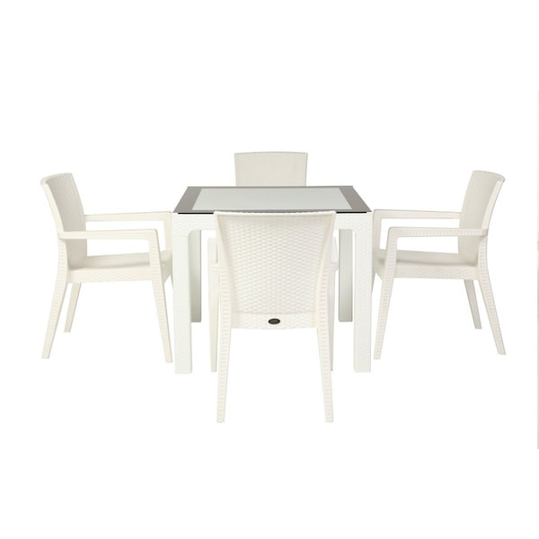 Elevate your outdoor dining experience with the Montana dining series. This 5-piece set includes 4 stackable chairs made of UV-resistant resin reinforced with glass fiber for durability. The modern look of the flat wicker is easy to clean, and the chairs are produced with gas-assisted injection technology for added strength. The square table is made of UV-resistant resin and features an easy snap-on self-assembly system, with galvanized tubes on the sides for improved stability. The resin structure of both the chairs and table will never rust or decay, making this set perfect for both commercial and residential use.