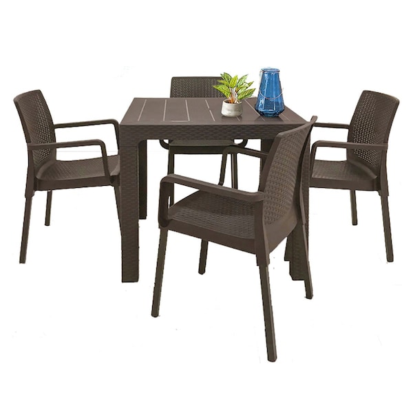 Enhance your outdoor dining experience with the Napoli dining collection. This 5-piece set features four stackable chairs and a square table, all made of UV-resistant resin with steel powder-coated legs in the same color as the frame. The flat wicker design adds a modern touch and makes cleaning a breeze. The table is made of UV-resistant resin and has an easy-click assembly method. Galvanized tubes on the sides improve stability, and the resin structure of both the table and chairs will never rust or decay.