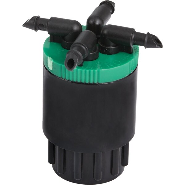 Converts individual sprinkler risers to bubblers for drip irrigation. 1/2 In. FPT (female pipe thread) inlet and 1/4 In. barbed outlet. Features adjustable flow control. Contains 4 pressure compensating bubblers in a single housing. Includes built-in filter.
