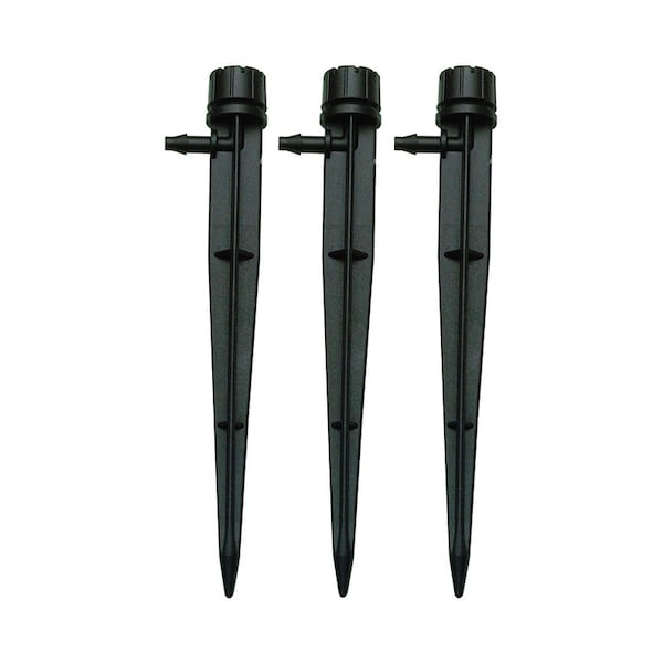 - • Emitter sits on top of the stake, where a 1/4 in. barbed inlet connects to 1/4 in. supply tubing; position stake in ground so the emitter can evenly water your plants root zone; Increase or decrease water flow by turning the dial