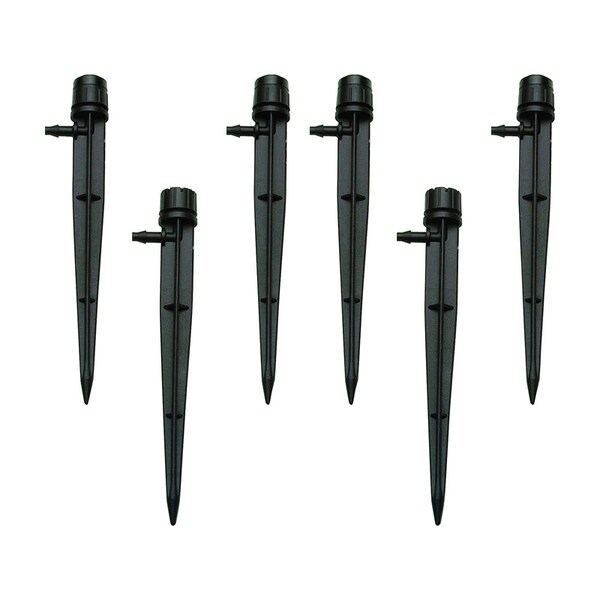 - • Emitter sits on top of the stake, where a 1/4 in. barbed inlet connects to 1/4 in. supply tubing; position stake in ground so the emitter can evenly water your plants root zone; Increase or decrease water flow by turning the dial