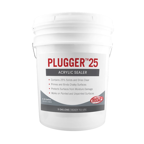 RainGuard Pro Plugger 25 Water-based Acrylic Sealer is a clear semi-satin water repellent for vertical and horizontal surfaces that are not exposed to hot tire traffic. It is a non-yellowing, low odor, low VOC, and non-toxic wood and masonry sealer. It is formulated to seal and bind chalky surfaces, and is an excellent top coat for paints and stains. Plugger 10 dries down to a clear semi-satin finish with minimal change to surface texture and color. Ideal for use on vertical/horizontal, painted/unpainted, interior/exterior surfaces such as: concrete, CMU blocks, brick, wood, porous natural and artificial stone, unglazed painted/unpainted tile, masonry, and stucco.