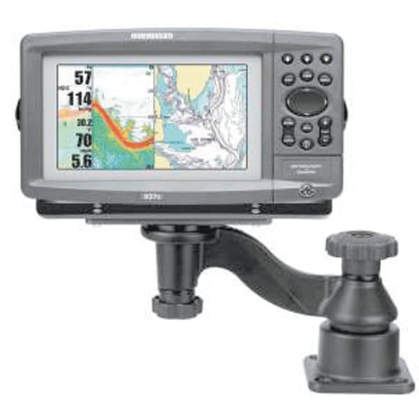 The RAM single swing arm mount is made of powder coated marine grade aluminum. It consists of a 6" long BENT swing arm mounted on a vertical surface mounting base. At the device mounting end of the mount is a rectangular 6.25" x 2" plate. There are two (2) pivoting points on the mount. One at the swing arm and base and one at the center of the rectangular plate and the end of the swing arm. Each pivoting point allows a complete 360° rotation.