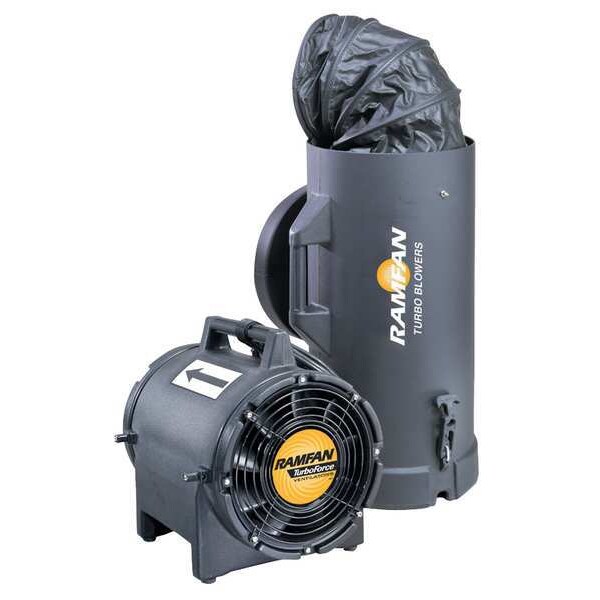 Confined Space Fan, Blower/Fan Speed 3,450 RPM, Includes 30 ft cord and ATEX plug-others, Fan, QuickCouple Canister, Current (A) 2 A, Duct Diameter 8 in, Horsepower 1/3 hp, Maximum Flow in Free Air 980 cfm, Voltage 115 V AC, Color Black, Material Polyethylene, Height 14 in, Length 35 in, Width 12 in, Standards ATEX 11 2 G Ex de11B T6 Gb IECEX UL Cert# 13.0062X, CE0539, Type Axial Explosion Proof