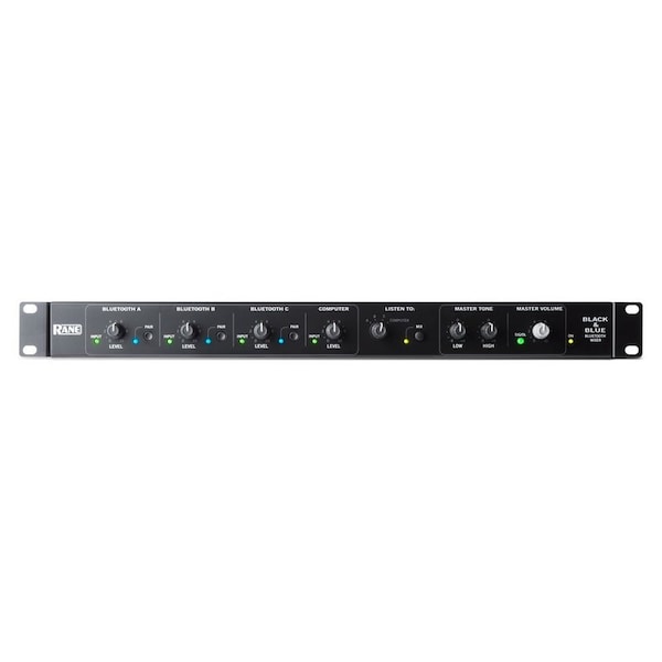 The Black & Blue is a simple, mono input-selector/mixer/amplifier with 3 discreet channels of Bluetooth, 3.5mm line input, and USB computer link for playback or recording. Inputs can be selected for monitoring individually, or all inputs mixed at once.Application examples are...Meeting Rooms Bluetooth A headworn mic, computer program through USB, XLR line out to powered speakers. Unit in mixer mode for mixing sources.Coffee Bar Bluetooth A mobile device, Bluetooth B is TV audio, Bluetooth C is barista headworn mic for calling orders...amplifier out to full-range speakers and XLR out to subwoofer. Unit in mixer mode for mixing sources.Trade Show Bluetooth A is tablet streaming music, Bluetooth B is presenter headworn mic...XLR out to powered speaker, and USB out streams to laptop computer to record the presentation. Unit in mixer mode for mixing sources. 3 discreet Bluetooth-registered inputs with individual volume controls and antennas Pairing buttons and status LEDs blue for each Bluetooth input Class compliant USB audio for computer recording and playback 3.5mm line input disconnects USB input audio Pre-fader signal LEDs green on each channel Source selector for solo monitoring or Mix All mode Shelving Bass and Treble Mix EQ Master volume control with 3-color LED green, yellow, red Power LED yellow XLR line output +20 dBu balanced 20W mono Class-D amplifier Bluetooth Specifications Version: 4.2 Profile: A2DP, AVRCP, HFP, HSP Range: Up to 88 feet 27m Maximum Transmission Power: 8 dBm Frequency: 2.402 - 2.480 GHz Connectors; 1 1/8-in 3.5mm TRS input 1 USB Type-B port 1 IEC power cable input 1 XLR output 1 4-position Euroblock output 3.81mm 3 Bluetooth antenna jacks Inputs / Outputs Amplifier Output: Mono, 20W 4?, 70V, 100V XLR Balanced Output Frequency Response: 20 Hz - 20 kHz THD+N: < 0.05% 3.5mm TRS Unbalanced Input Frequency Response: 20 Hz - 20 kHz THD+N: < 0.05% USB: 44.1 kHz / 24-bit Power Connection: IEC Voltage: 100 - 240 VAC, 50/60 Hz Consumption: 40W Dimensions width x depth x height: 19-in x 11-in x 1.7-in 483 x 286 x 44mm Weight: 8.6 lbs 3.9kg Bluetooth range is affected by walls, obstructions and movement. For optimal performance, place the product in a location that is unobstructed by walls, furniture, etc.