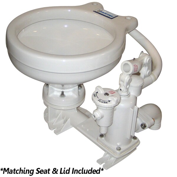 PHII. Manual Operation, White, Marine-Size, Mid-priced, high quality, non-macerating Manual toilet. Reliable, high-quality design uses sea or lake water,Benefits, Good choice for sailboats and mid-size powerboats, Simple design means economical, trouble-free quiet operation, Powerful flushing action, Simple and flexible installation for mounting above or below waterline, Easy to clean and maintain, Dry pumping is easier because air vent reduces back pressure, Double action piston pump simultaneously draws new flush water as it discharges the wastewater, Can be used with on-board treatment systems (such as the Lectra/San) and/or holding tanks, Each unit is assembled by hand, individually tested