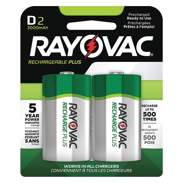 Rechargeable Battery, Battery Size D, Battery Chemistry Nickel-Metal Hydride, Voltage - Batteries 1.2V DC, Recharge Time 24 hr, Capacity - Batteries 3,000 mAh, Shelf Life 5 yr, Rechargeable Up To 500 Times, Precharged Yes, Max. Operating Temp. 122 Degrees F, Min. Operating Temp. -4 Degrees F, Standard Battery Pack Size 2, Diameter 1.31 in, Height 2.33 in, Overall Height 2.39 in, Standard Battery Series Recharge Plus, Package Quantity 2