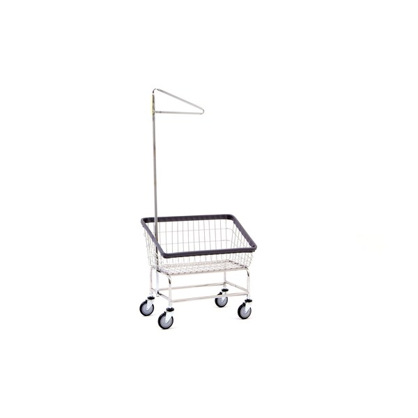 The large capacity tilted basket is designed for easy loading and unloading of front load washers and dryers. The bases are built with fully welded 7/8 in heavy steel tubing. The basket also features patented 5 in Clean Wheel System casters with non-marking polyurethane tires, which reduce debris pick up in hubs, and a ball bearing design that provides years of trouble-free service. Comes with chrome plated single pole rack to hang garments while preventing wrinking. The top caster bearings are shielded from dirt and chemicals by new bearing raceway guards. The basket also has new larger and softer non-marking bumpers to protect equipment and walls from damage. The chrome plating is sturdy, bright, and commercial quality, which saves maintenance costs.