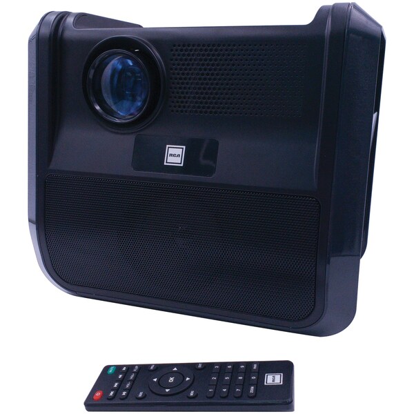 Watch movies on the go! This Graphite RCA Portable 480p Projector Entertainment System delivers true‐to‐life color projections on virtually any flat surface. It is ideal for use on a projector screen, wall, side of a house, or ceiling. 2 built-in stereo speakers deliver powerful audio, and the Bluetooth receiver allows you to connect to other devices. You can project up to a 150 in. picture size (30 in. to 150 in. minimum/maximum picture size and 37 in. to 100 in. optimal picture size). This projector supports 1080p (via HDMI input), 1080i, 720p, 576i, 480p, and 480i and has a native resolution of 800 x 480. Inputs include HDMI, A/V, and USB, and supported video formats include MPEG1, MPEG2, MPEG4, AVi, MOV, MJPEG, and MKV. The built‐in lithium battery (8,800 mAh) allows you to enjoy hours of entertainment. This portable projector is ideal for dark viewing environments, for optimal viewing performance. Accessories include a remote control and AC power adapter.