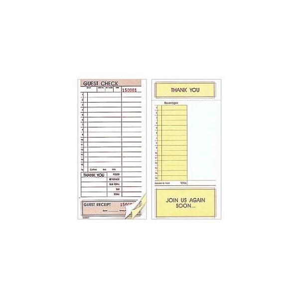 Guest checks; 4 1/2 in x 9 in; 3-part; Thick, stiff third copy; Perforated receipt at bottom; Padded; Sold by the case of 8 packs of 250 checks