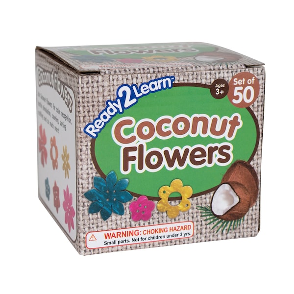 This set includes 50 flower-shaped coconut shell pieces in six shapes and five colors: red, yellow, orange, pink and blue. Each flower features small holes to thread necklaces and bracelets! You can also use these colorful flowers for crafting, sequencing, sorting, counting and more. With 5 bright colors, Coconut Flowers are also ideal for color recognition activities. The coconut shells are cut, cleaned and polished by hand to create these beautiful manipulatives. Pieces retain the concavity of the original coconut shape. Because Coconut Letters are made from coconut shells, they are naturally very strong and durable. Color and shape quantities may vary. For ages 3+. Sizes: 1.6'' - 0.75'' dia.