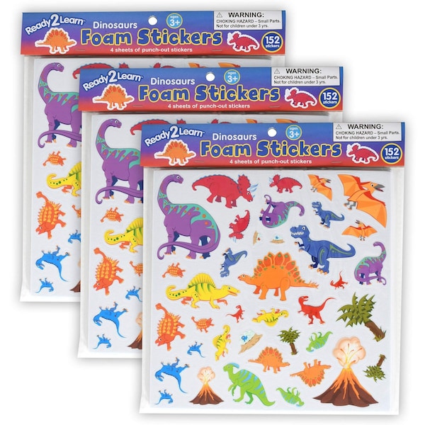 - DINOSAUR STICKERS -- Sold as 3 packs, each dinosaur-themed sticker pack includes 4 foam sheets, each with 38 punch-out stickers in 13 different images. Decorate with prehistoric designs!