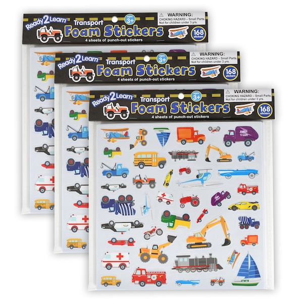 - TRANSPORT STICKERS -- Sold as 3 packs, each transport sticker pack includes 4 foam sheets, each with 42 punch-out stickers in 21 different images. Decorate with land, air and sea vehicles!
