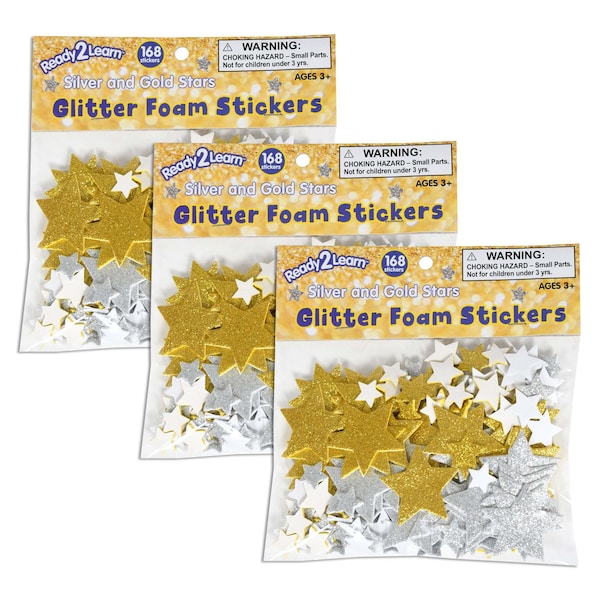Create sparkly scenes and personalize your stuff with foam stickers! Each sticker pack includes 168 star-shaped stickers in silver and gold. The set also features 3 different sizes. These self-adhesive stickers easily peel away from their wax sheets for frustration-free craft time. These 3D stickers are durable, thick and easy to hold. Use these stickers to decorate DIY projects or personalize water bottles, computers, phones and more! Give these stickers as rewards after chores and homework. Or, use them as party favors and stocking stuffers. Kids will love to collect these glittery star stickers! Size of largest star: 1.6"L. Size of smallest star: 0.6"L. Sold as 3 packs for a total of 504-stickers.