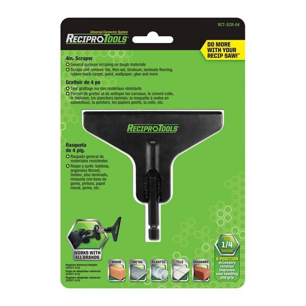 Secure the universal quick-connect adapter just like a standard saw blade. Then lock in a ReciproTools accessory to remove tile, grout and linoleum, rubber backed carpet and pad.