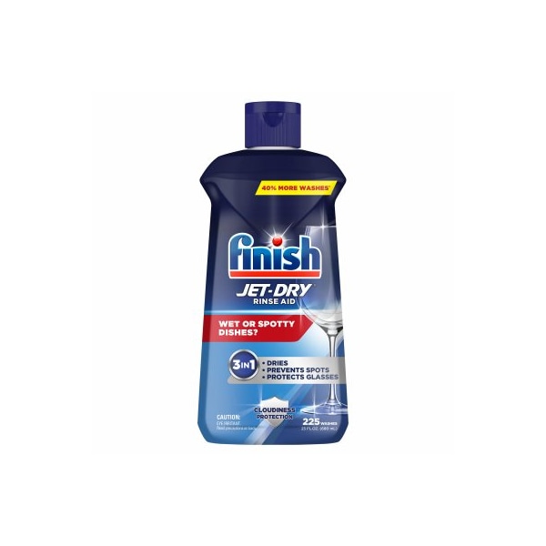 Finish JetDry Rinse Aid, 23 oz Has 5x Power Actions and a Glass Protection ingredient for shinier and drier dishes vs detergent alone For optimal results, use with your detergents Experience shiny dishes and spot and film protection vs dishwasher detergent alone with our Finish Jet Dry Dishwasher Rinse Aid It works with your dishwashing detergent to rinse away stubborn leftover food, spots, and film for sparkling dishes, glasses and utensils It's easy to use as well Simply fill your rinse aid dispenser with Finish JetDry Rinse Aid and it will be automatically released in the rinse cycle every time your dishwasher runs