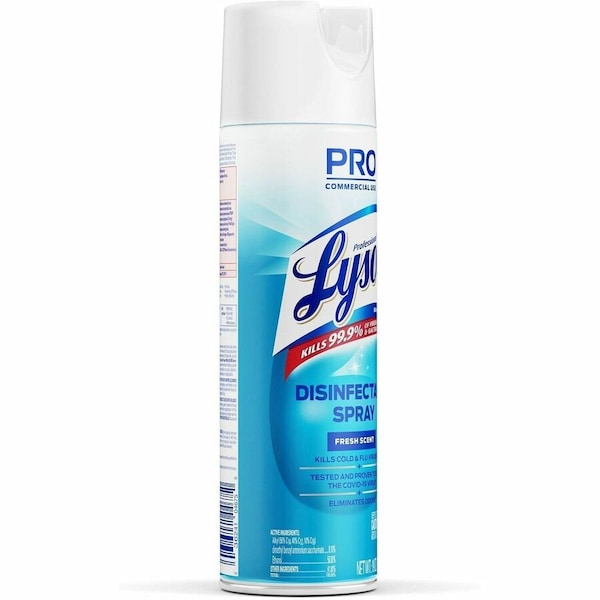 Boost customer confidence with Lysol Professional Disinfectant Spray thats safe to use on hard and soft surfaces. Lysol kills 99.9% of viruses and bacteria, including the virus that causes COVID-19 in 15 seconds, as well as cold and flu viruses when used as directed. Help protect high-traffic areas and high-touch surfaces, including desks, bathrooms, doorknobs, and railings. Deliver hospital-type disinfection into soft surfaces, including upholstery, curtains, sofas, mattresses, and cushions. Meet customer and staff expectations around disinfection. Simply spray and let air dry. Value PackStock up and save! Application: Disinfectant/Sanitizer; Applicable Material: Hard, Non-Porous Surfaces; Chemical Compound: Alkyl 50% C14, 40% C12, 10% C16 Dimethyl Benzyl Ammonium Saccharinate; Ethanol; Dirt Types: Bacteria; Fungus; Germs; Mildew; Mold; Viruses.