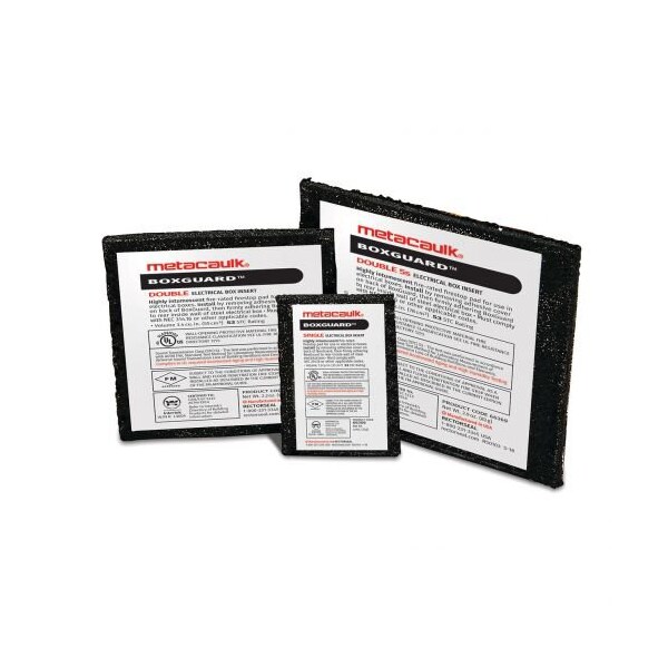 Metacaulk Box Guard is a 1-component fire-rated pad for use in electrical boxes. When exposed to fire, it will expand forming a char that seals the opening, prevents spread of flames & limits temperature rise on unexposed surfaces.