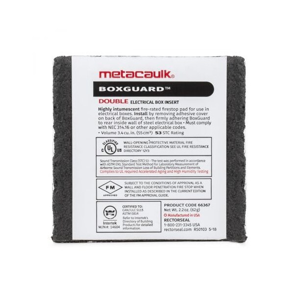 Metacaulk Box Guard is a 1-component fire-rated pad for use in electrical boxes. When exposed to fire, it will expand forming a char that seals the opening, prevents spread of flames & limits temperature rise on unexposed surfaces.