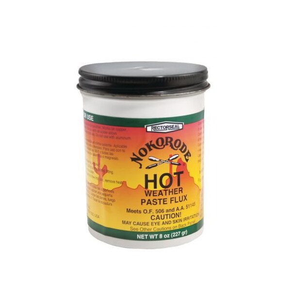 Nokorode Hot Weather Flux is a lead free, soft soldering paste flux especially formulated to remain thick in hot weather applications. It is ideal for use with 95/5 and other common solders. It cleans and fluxes the joint area all at one time.